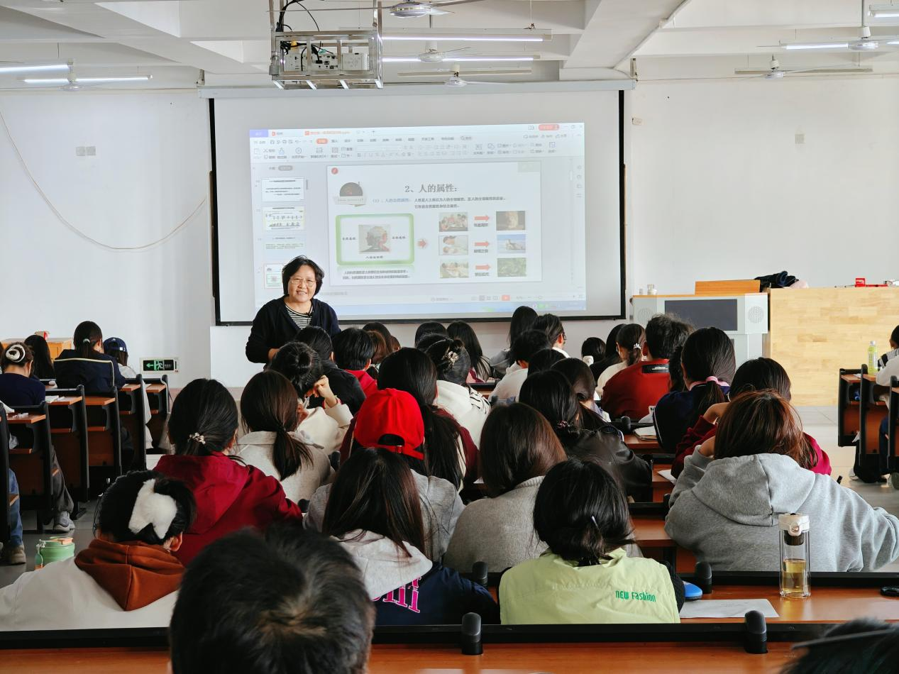 教学中,程亚萍老师系统梳理了古今中外哲学思想中关于“人的本质”的重要论述,重点阐释了马克思主义关于人的本质的科学观点。她注重理论与实践的有机结合,通过典型案例的引入与逻辑严密的讲解,引导学生深入理解“人的本质在其现实性上是一切社会关系的总和”这一核心命题。整堂课教学内容重点突出、逻辑层次分明、理论阐释透彻,既体现了扎实的学理支撑,又紧密贴合学生认知规律,充分展现了主讲教师深厚的理论素养与精湛的教学设计能力。课堂氛围积极活跃,学生围绕“人的本质”“个人与社会关系”等关键理论问题踊跃发言、积极思辨。