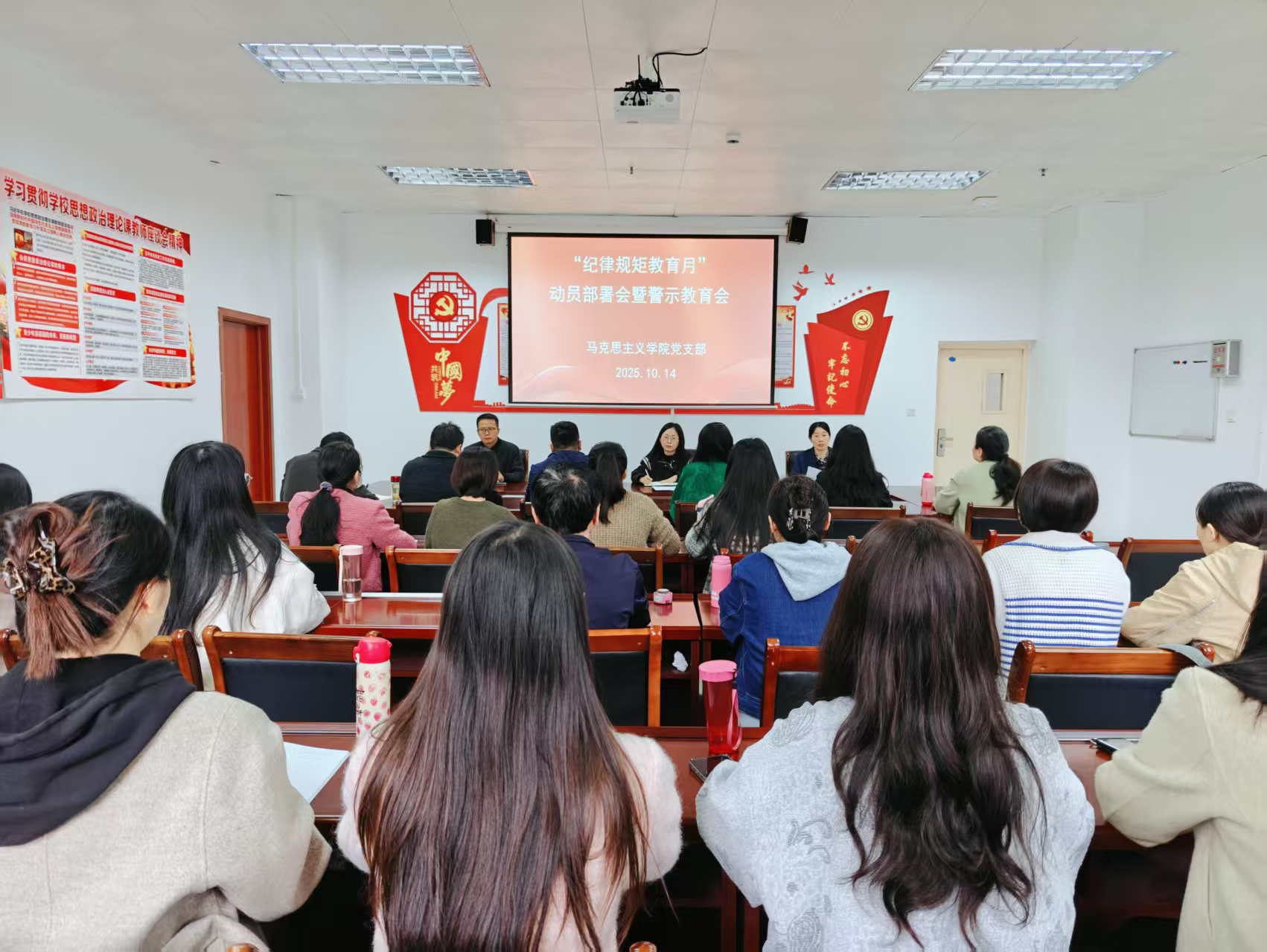 2025年10月14日下午,马克思主义学院党支部在学院会议室召开“纪律规矩教育月”动员部署会暨警示教育会。学院全体党员同志参会,会议由党支部书记郑玉秀主持。